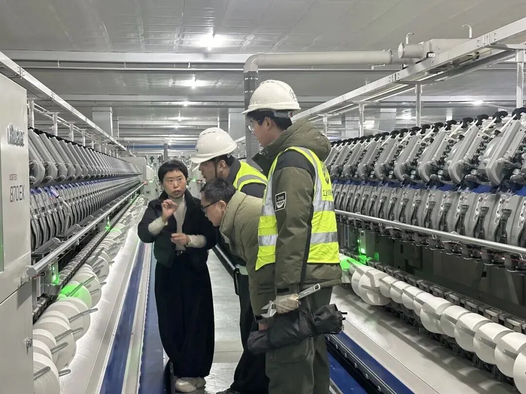 “先把防护护栏的固定螺栓再拧紧些,确保作业人员操作安全。”董骏蹲下身,用扳手仔细检查护栏接口,对松动部位进行加固、对磨损处进行调试。接着两人又来到正在运行的梳棉机前,专注查看梳棉机的PLC控制面板,逐一核对设备运行参数、排查线路隐患,不放过任何一个安全细节。